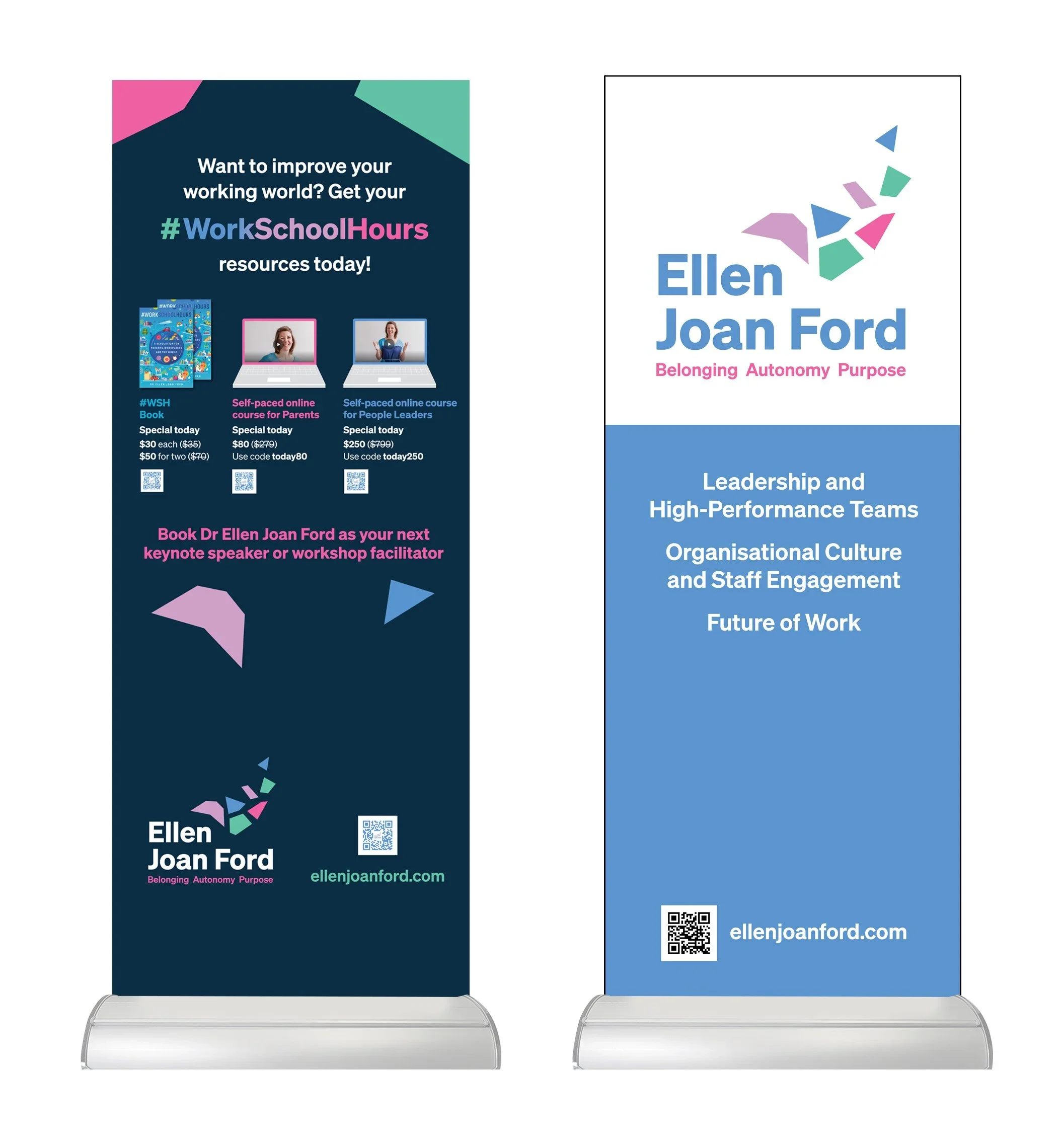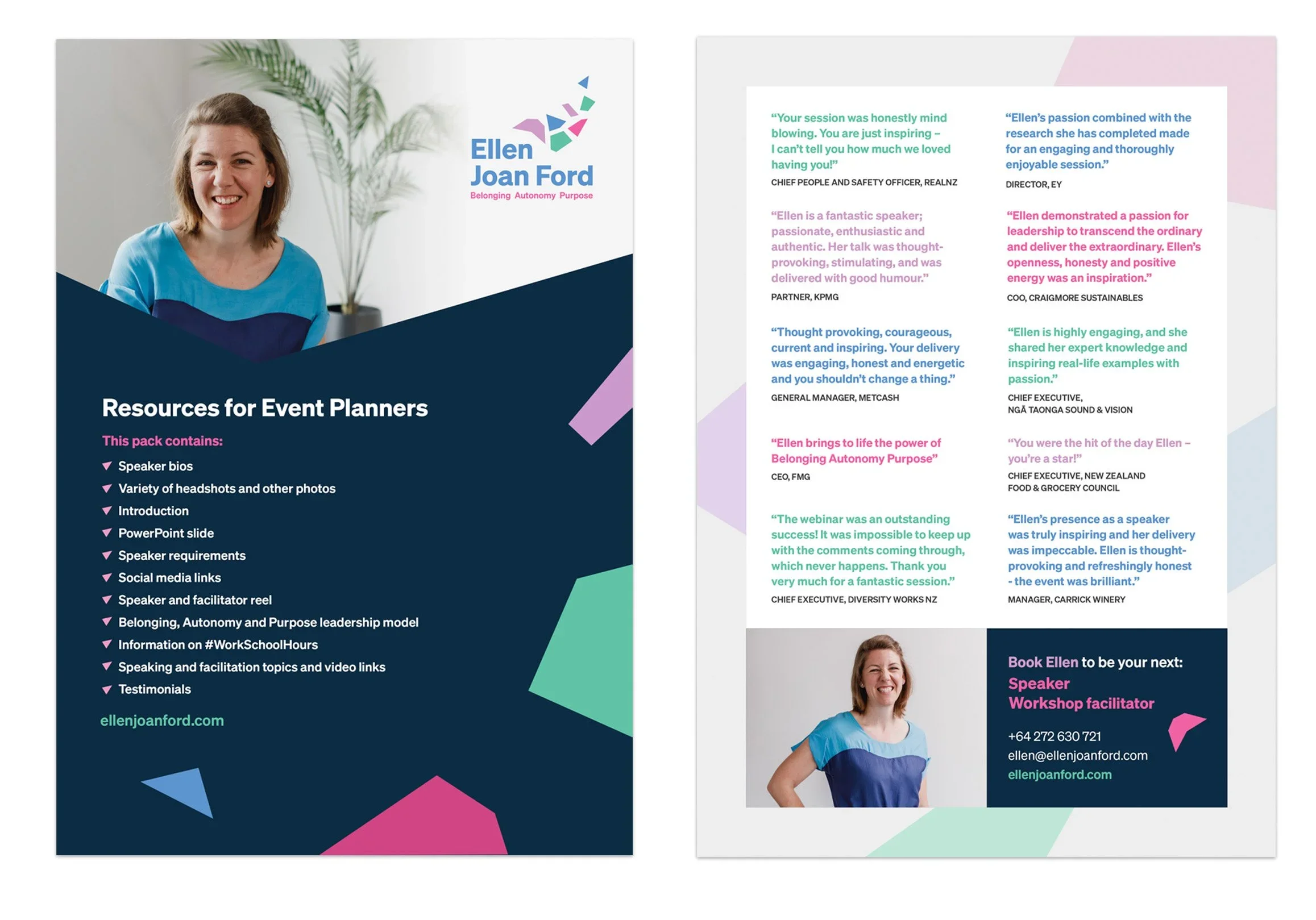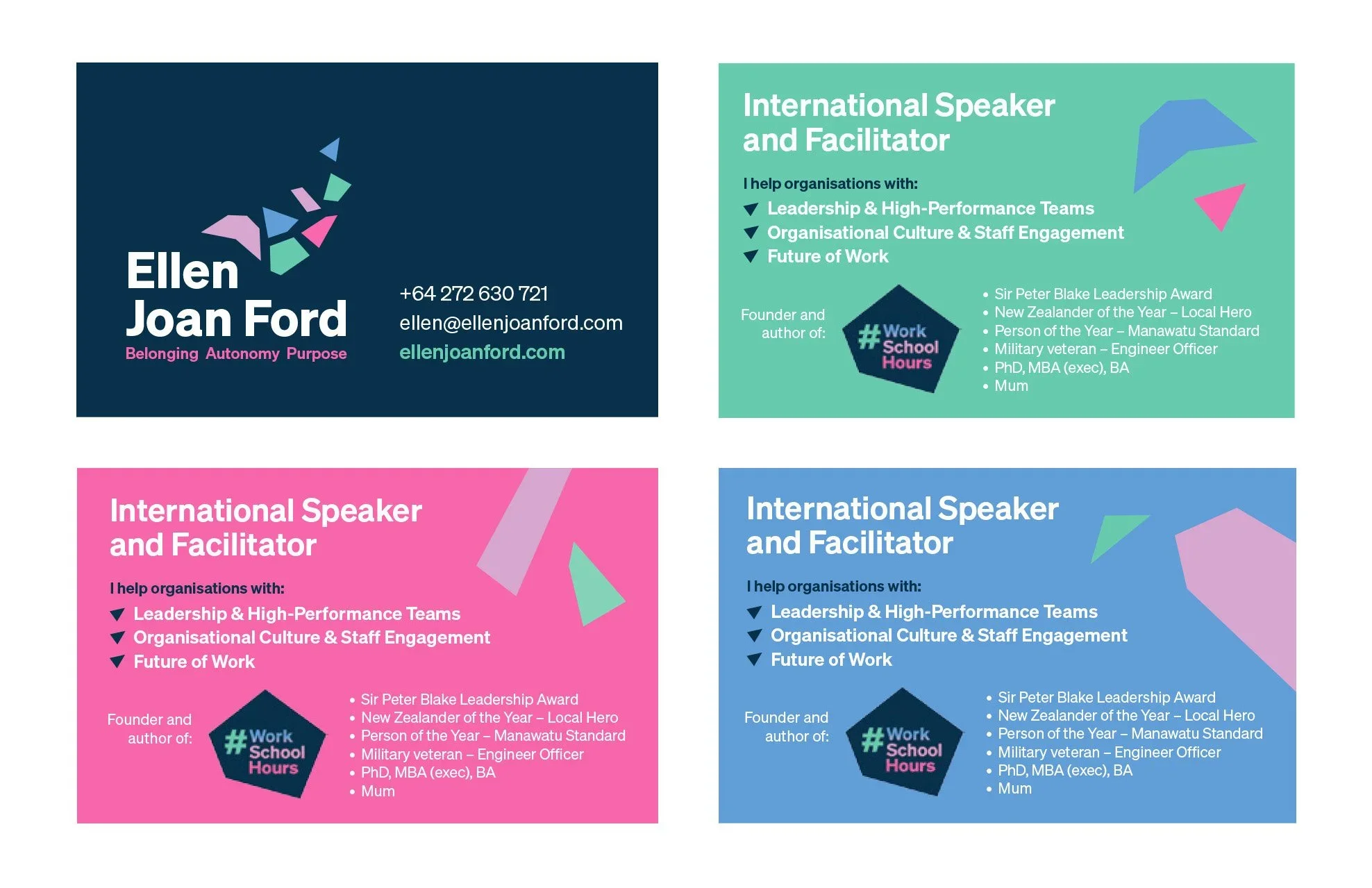 Ellen Ford was after a brand that represented her vibrant speaking style and personality, and set her apart from other keynote speakers. Her brand needed to visually convey the ideas of motion and flexibility given this relates to the content she is communicating around belonging, autonomy and purpose in the workplace. The outputs for this client included brand stationary, printed documents, large-scale signage, digital marketing, and a new website. The final brand look expresses a harmonious balance between individuality and professionalism.