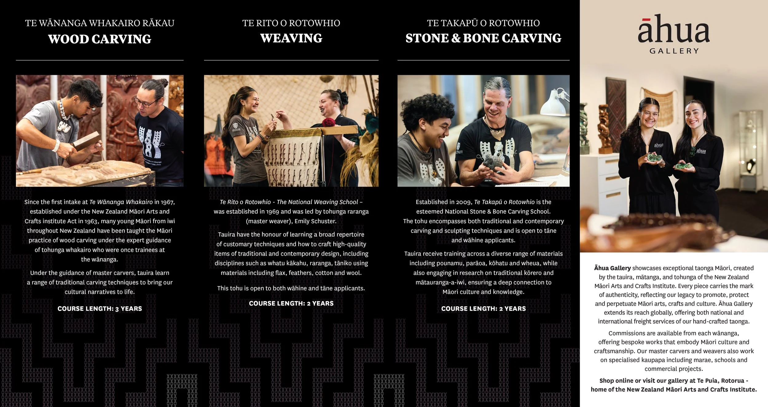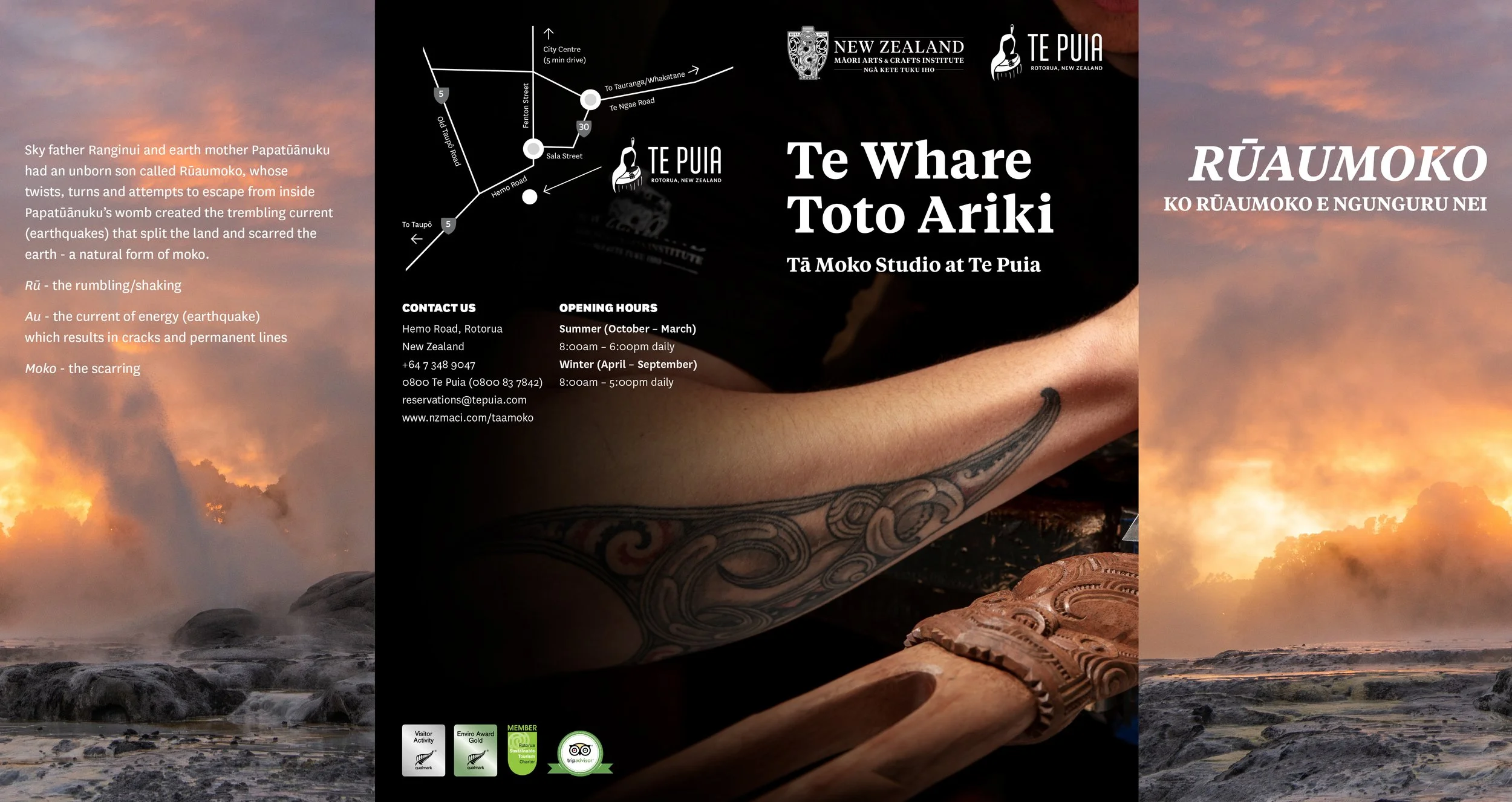 Marketing collateral has included brochures and publication design, like this one created for the Tā moko studio previously onsite at the New Zealand Māori Arts and Crafts Institute.